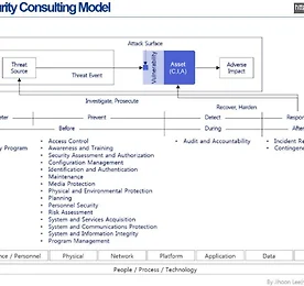 정보보호 표준들을 참조하여 작성한, 정보보호 컨설팅의 개요, 모델(Cybersecurity Consulting Model)입니다. 위험 모델, 정보보호 모델, 정보보호 프레임워크를 근간으로 조직에 대한 진단(Assess) 및 보호통제 수립(Protect)하는 일이 정보보호 컨설팅에서 해야 하는 일입니다. 최근의 정보보호에서 취약성을, 특히 플랫폼이나 어플리케이션과 같은 정보시스템 대한 취약성을 찾는 데에 과도하게 초점이 맞춰져 있는 것이 아닌가 하는 생각을 종종 합니다. 절차나 내부 통제, 아키텍처 등에서도 취약성이 있을 수 있습니다. 정보시스템에 있는 취약성을 찾아내서 보완하여 보안성을 높이는 일이 중요하긴 하지만, 이런 활동을 전반적인 정보보호 수준, 성숙도를 높이는 데에서는 일부분일 수 밖에 없습니..